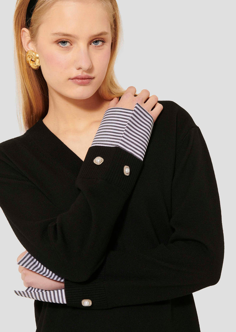 This sweater has a V-neck and long sleeves. The so Tara touch lies in its trompe l'oeil cuffs in black-striped poplin decorated with a jewel button. Made in merino wool, it's soft with an ultra-comfortable cashmere feel.